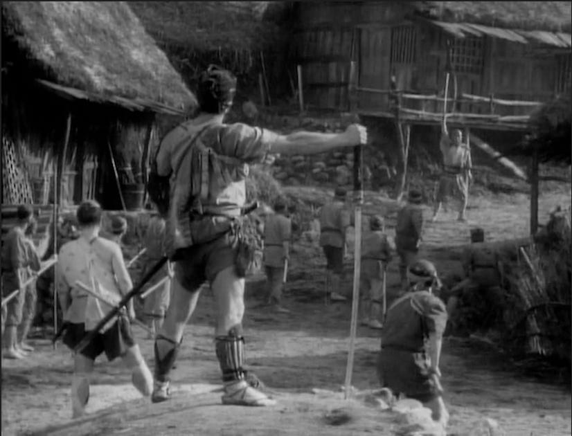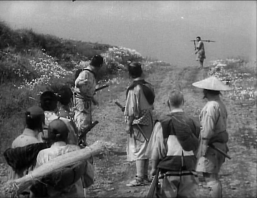 Kurosawa builds a continuous series of seven shots, even while composing in the boxy 4x3 aspect ratio. He places the samurai at different depths, shooting with enough light to close down his T-stop to make each image layer appear focused.