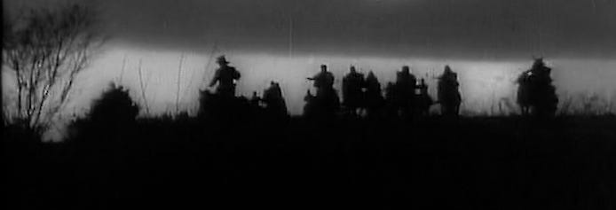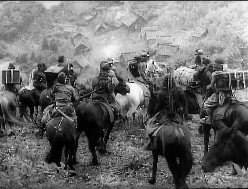 Seven Samurai opens with inky black smudged exteriors, the sounds of a galloping horde turn into bandits approaching a village. The camera towers over the men on horseback, peering from a ridge to a circle of thatch huts below. The long lens compression makes the village look more present and vulnerable and intensifies the shots of bandits on horseback.