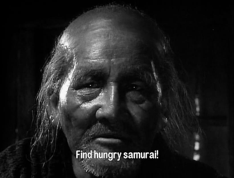 After much argument, the group marches across the river to consult the Village Elder, who directs them to find a group of samurai for protection. “But all we have for payment is rice,” they protest. The elder calmly responds, “Find hungry samurai.”