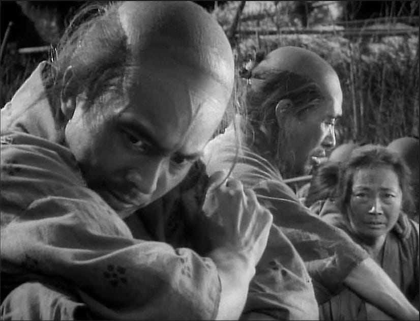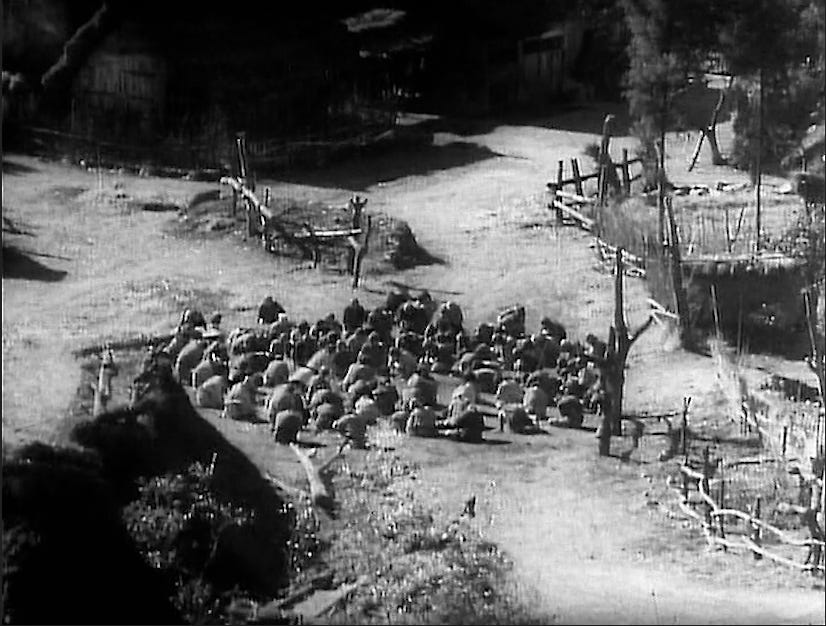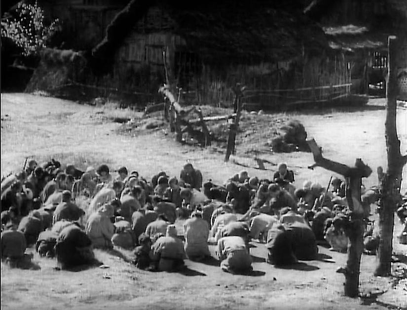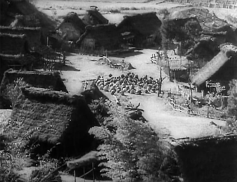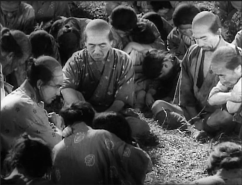 Kurosawa skips ahead to the town meeting with a series of axial cuts. We see dozens gathered in a circle, starting high and wide over the village square. The camera pops in directly on the z-axis, one shot at a time, until we land in the middle of the group, surrounded by layered medium close-shot compositions.